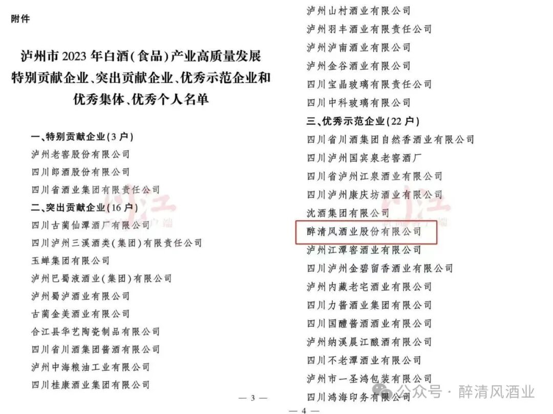 3月15日,醉清风酒业成功入选泸州市2023年白酒(食品)产业高质量发展优秀示范企业。