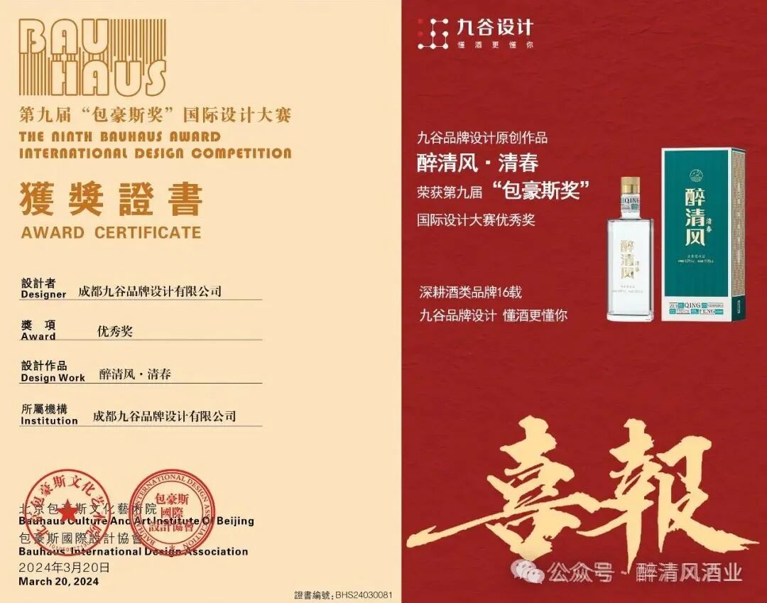 3月15日,在包豪斯国际设计协会与北京包豪斯文化艺术院联合发起主办的第九届“包豪斯奖”国际设计大奖赛上,醉清风“清春”荣获优秀奖。